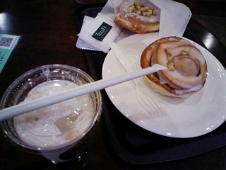 スタバ的な店に入って、飲み物とシナモンロールを注文